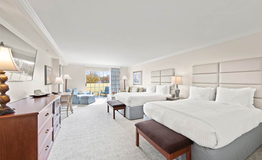 Step into Rehoboth’s most spacious suite-sized double queen guest rooms with open balcony to sit and enjoy the fresh sea air and views of Rehoboth. Enjoy luxurious bedding with linens, large sitting areas with two chairs & ottoman seating, desk area, large flat screen HDTV, coffee area with mini refrigerator, in-room safe, extra large granite bathroom with double sink bowls, tub/shower, vanity mirror, luxurious robes & towels and turn down service nightly.